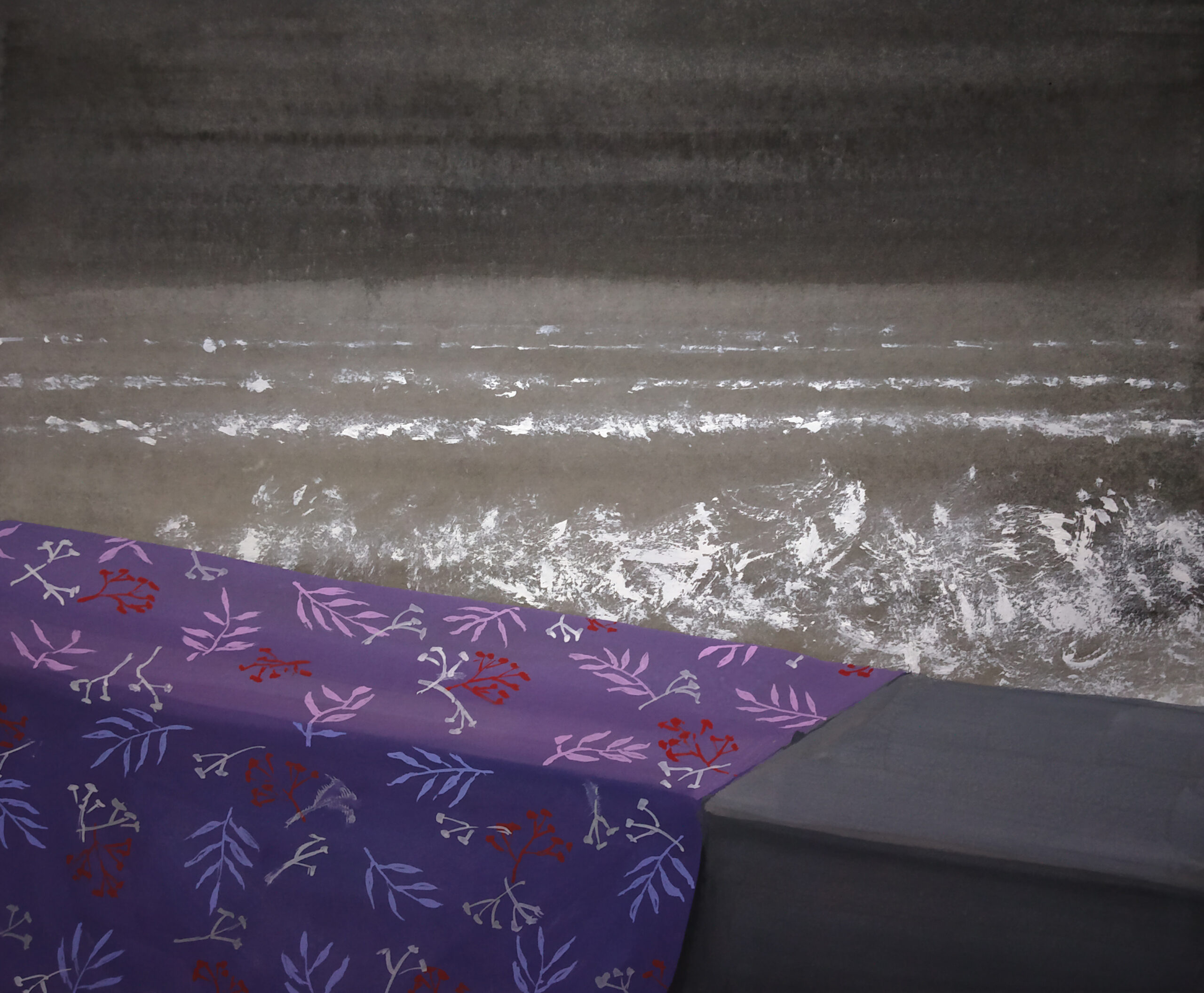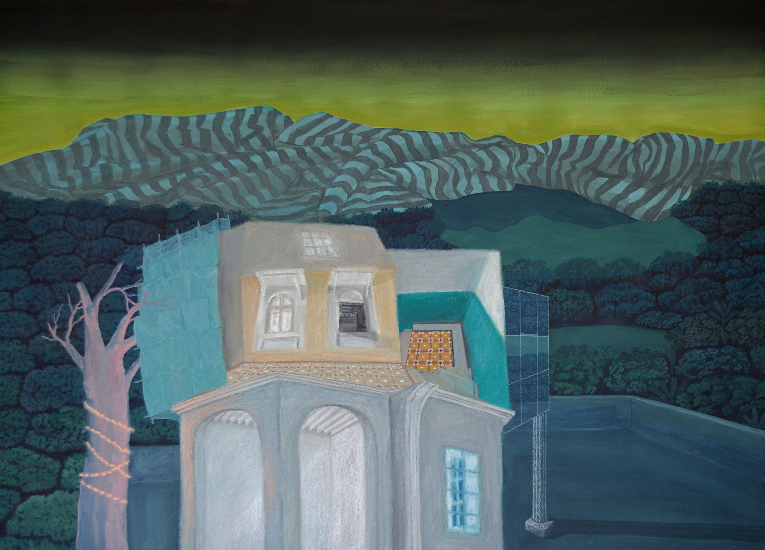 Four December Nights, a Broken Bridge, Gharaondā and a Dream | 2022 | Ink, Gouache and Oil Pastels on Paper | 28 x 40 in