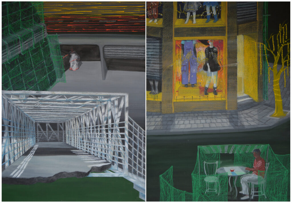 Nine Images of a Night in the City, in Outskirts and at Home | 2022 | Gouache, Ink and Oil Pastels on Paper | 21 x 29 in | Private Collection