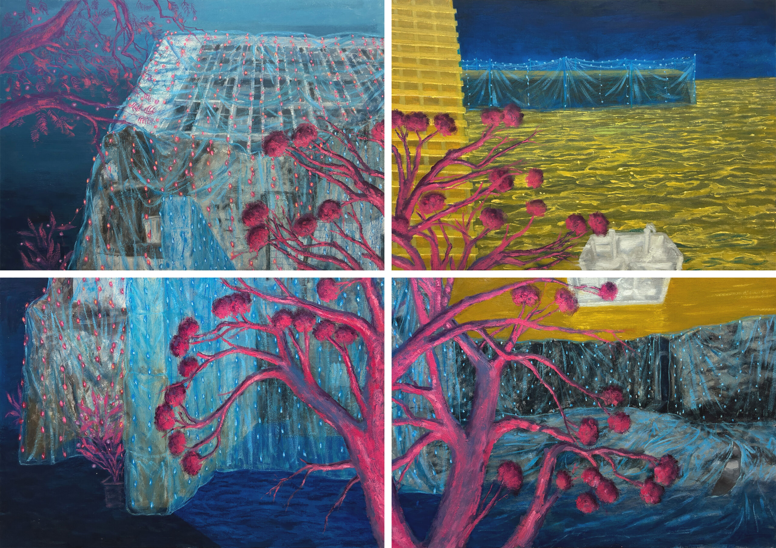 Inauguration of Modern Temple and Other Images | 2024 | Ink, Oil and Oil Pastels on Paper | 38 x 54 in (Quadriptych)